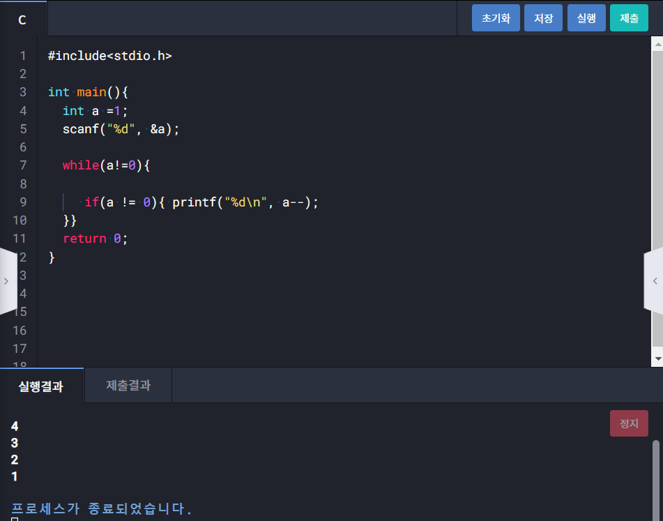 1074 : [기초-반복실행구조] 정수 1개 입력받아 카운트다운 출력하기1