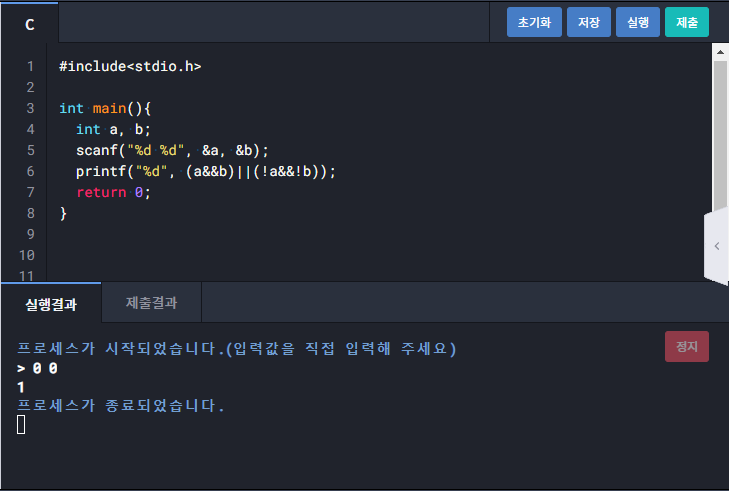 1057 : [기초-논리연산] 참/거짓이 서로 같을 때에만 참 출력하기
