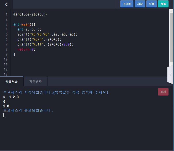 1046 : [기초-산술연산] 정수 3개 입력받아 합과 평균 출력하기