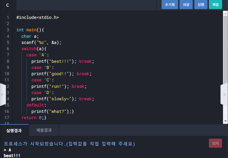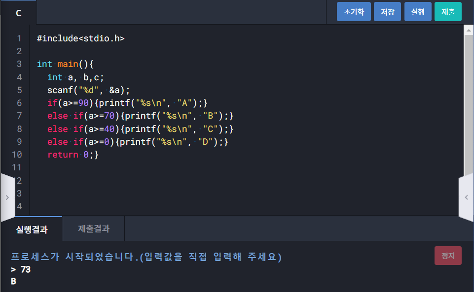1069 : [기초-조건/선택실행구조] 평가 입력받아 다르게 출력하기