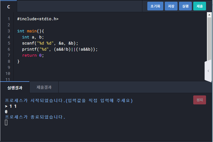 **1056 : [기초-논리연산] 참/거짓이 서로 다를 때에만 참 출력하기**