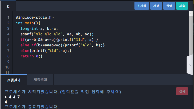 1064 : [기초-삼항연산] 정수 3개 입력받아 가장 작은 수 출력하기