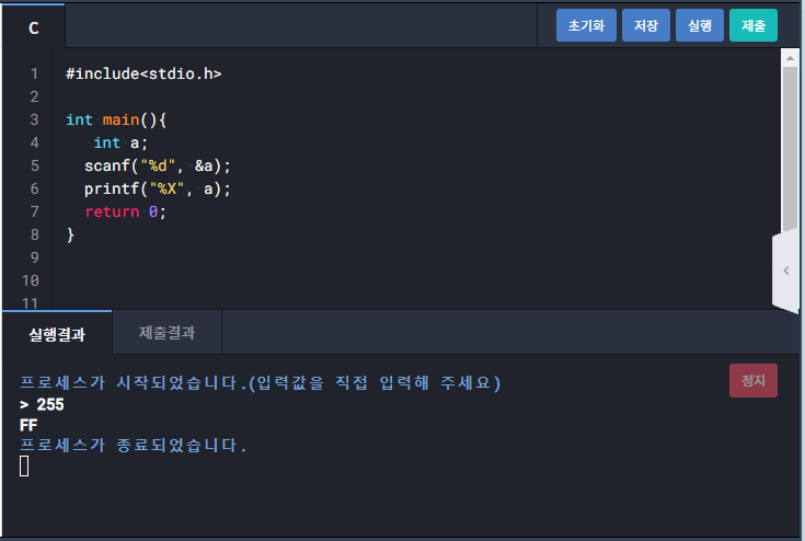 1032 : [기초-출력변환] 10진 정수 입력받아 16진수로 출력하기1