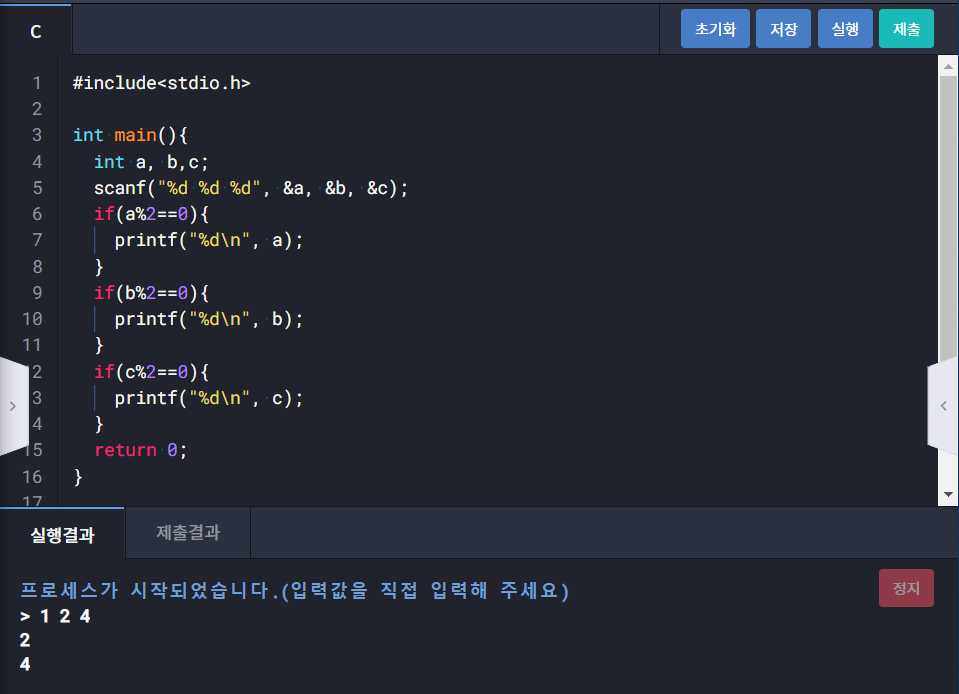 1065 : [기초-조건/선택실행구조] 정수 3개 입력받아 짝수만 출력하기