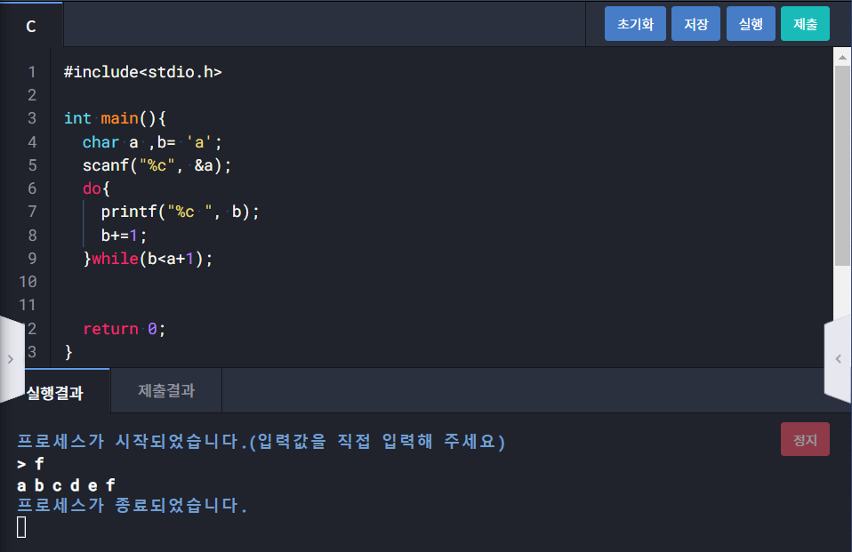 1076 : [기초-반복실행구조] 문자 1개 입력받아 알파벳 출력하기