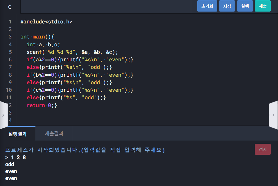 1066 : [기초-조건/선택실행구조] 정수 3개 입력받아 짝/홀 출력하기