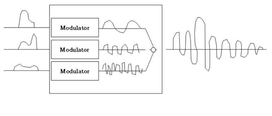 이 유사한 신호들은 다중화기 내부에서 제각기 다른 반송주파수로 변조됩니다.