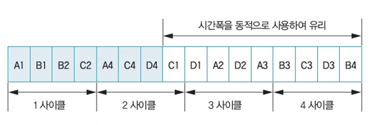 - 컴퓨터에 연괼되는 슬롯이 고정되며 정해진 시간 할당량만큼 규칙적으로 분배합니다.
