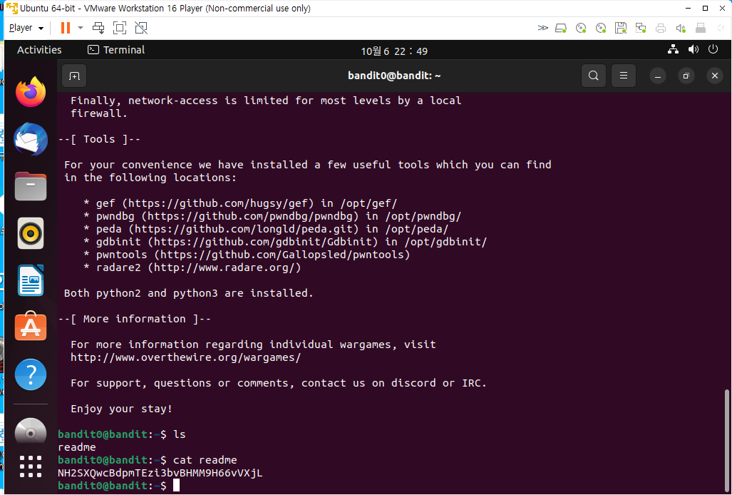 Level 0 → 1 문 : The password for the next level is stored in a file called readme located in the home directory. Use this password to log into bandit1 using SSH. Whenever you find a password for a level, use SSH (on port 2220) to log into that level and continue the game. : 다음 문제로 가는 패스워드는 readme라고 불리는 파일에있다. cat readme로 읽어준다. Level 1 → 2 문 : The password for the next level is stored in a file c..