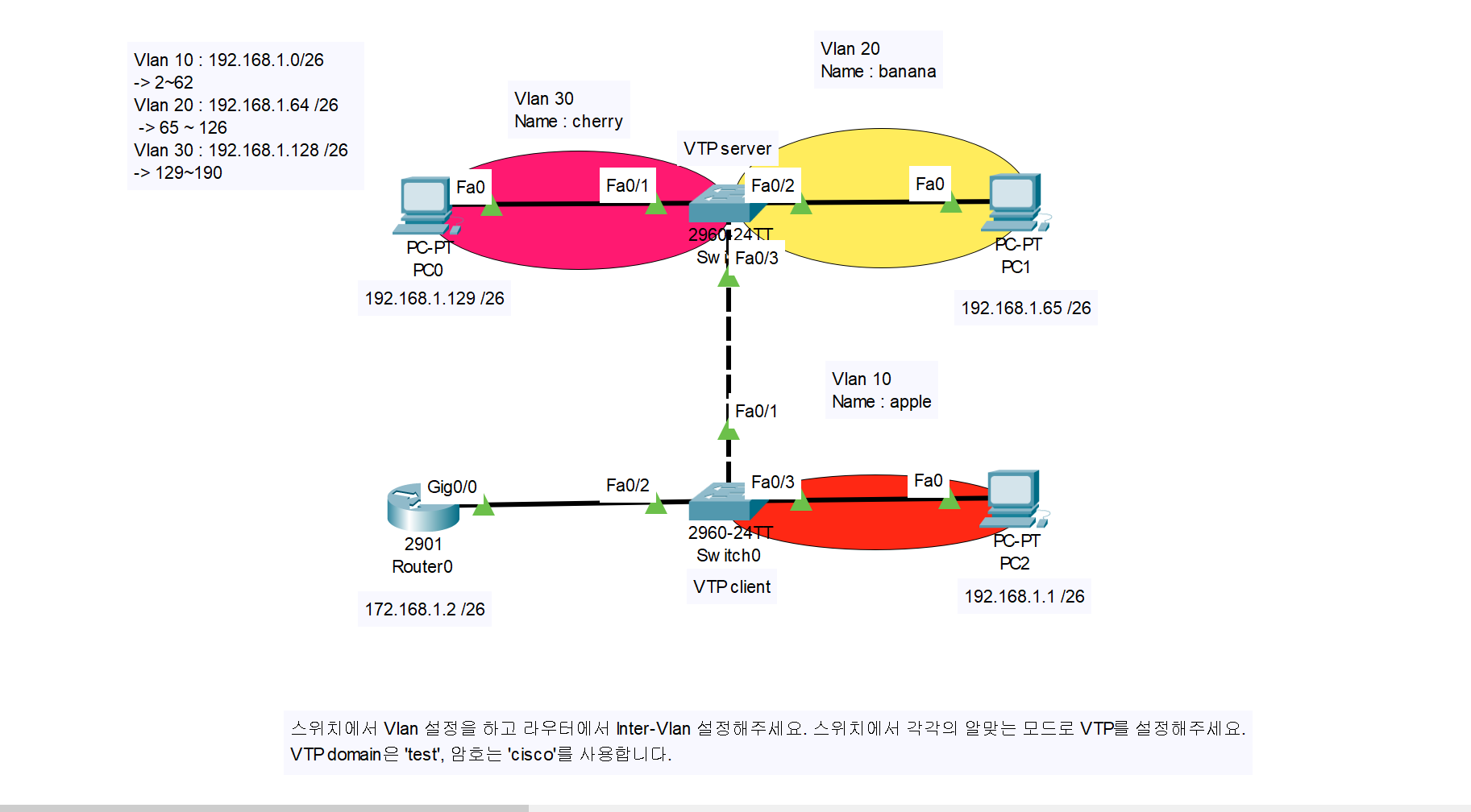 VTP(Vlan Trunking Protocol)란? - CISCO전용 프로토콜로, 연결된 스위치끼리 Vlan의 정보를 주고 받아 자동으로 동기화하는 프로토콜입니다. - 관리해야하는 스위치가 많은 경우 유용하게 쓰이지만, 보안상의 이유로 거의 사용되지 않습니다. (https://light-touch-fish.tistory.com/19) 1. sever (1) en (2) conf t (3) vtp mode server (4) vtp version 2 : vtp의 버전 설정(1과 2가 있으며 기본적으로는 2로 되어있음) (5) vtp domain [Word] : 서버의 이름 설정, 클라이언트는 이도메인으로 접속 (6) vtp password [Word] : 서버의 비밀번호 설정 2. client (1) e..